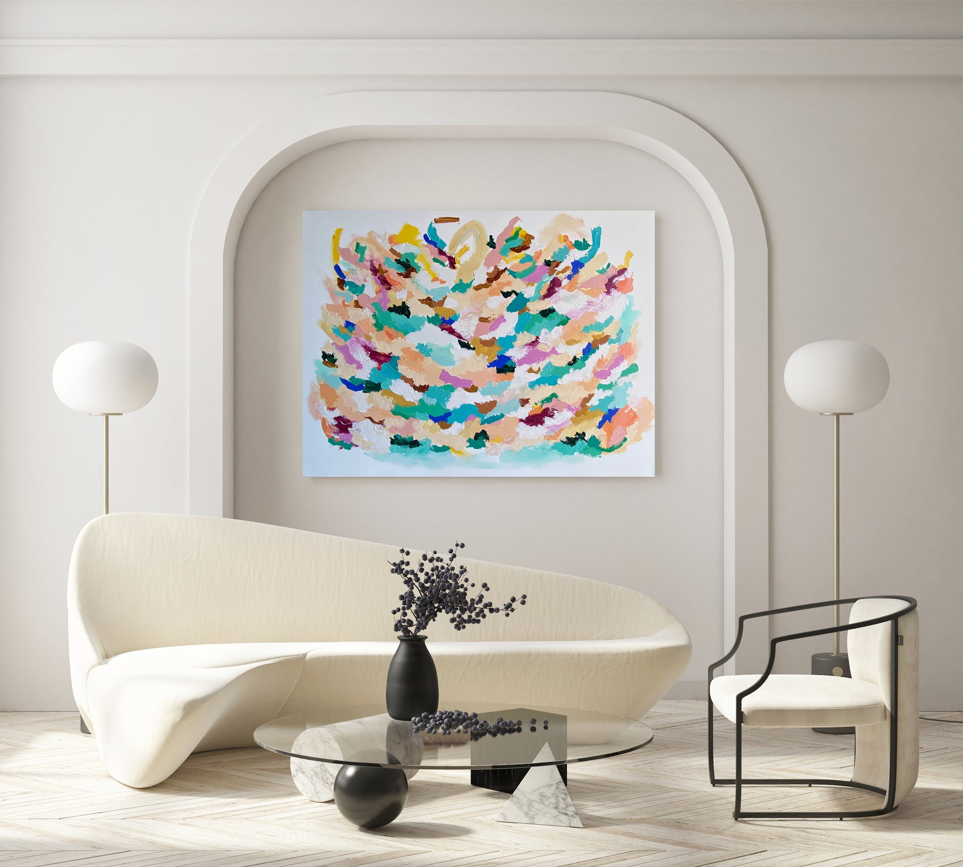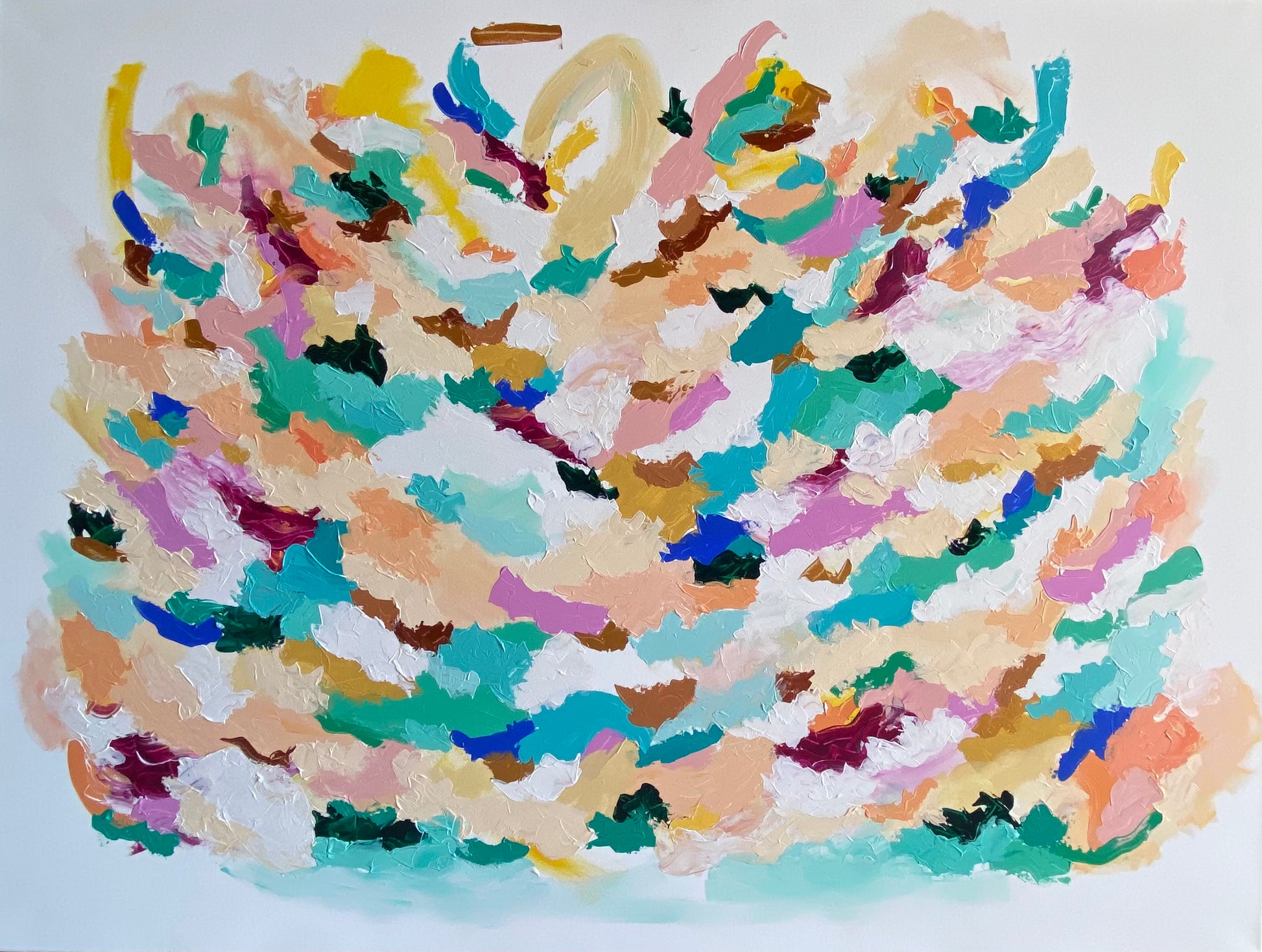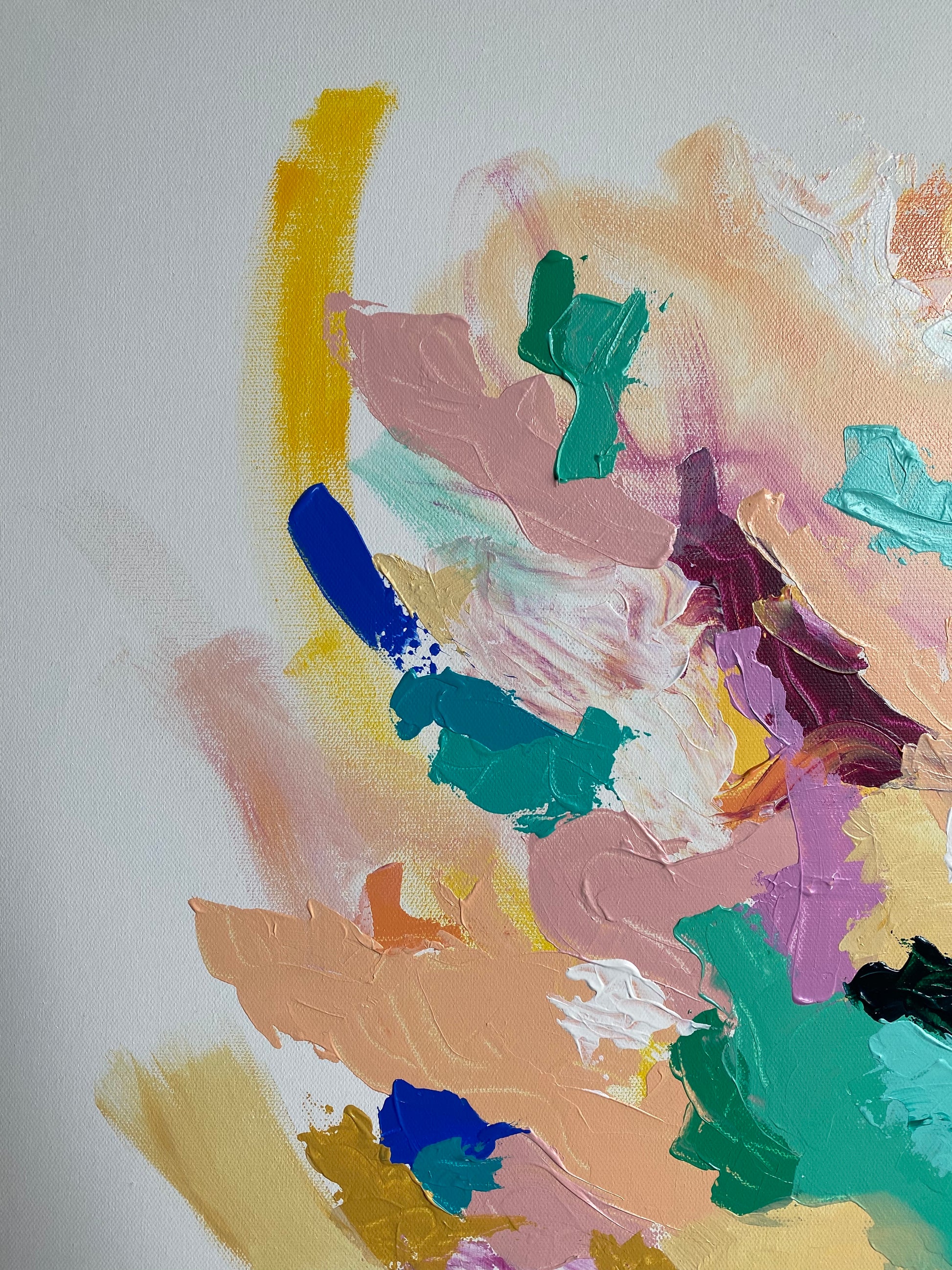 Luminous, dreamy palette knife strokes dance across this piece to create an earthy, organic composition that is soft yet bold, full of life and movement. I was inspired by the softness of color transition in natural elements including changing leaves, water, stone and the sky.