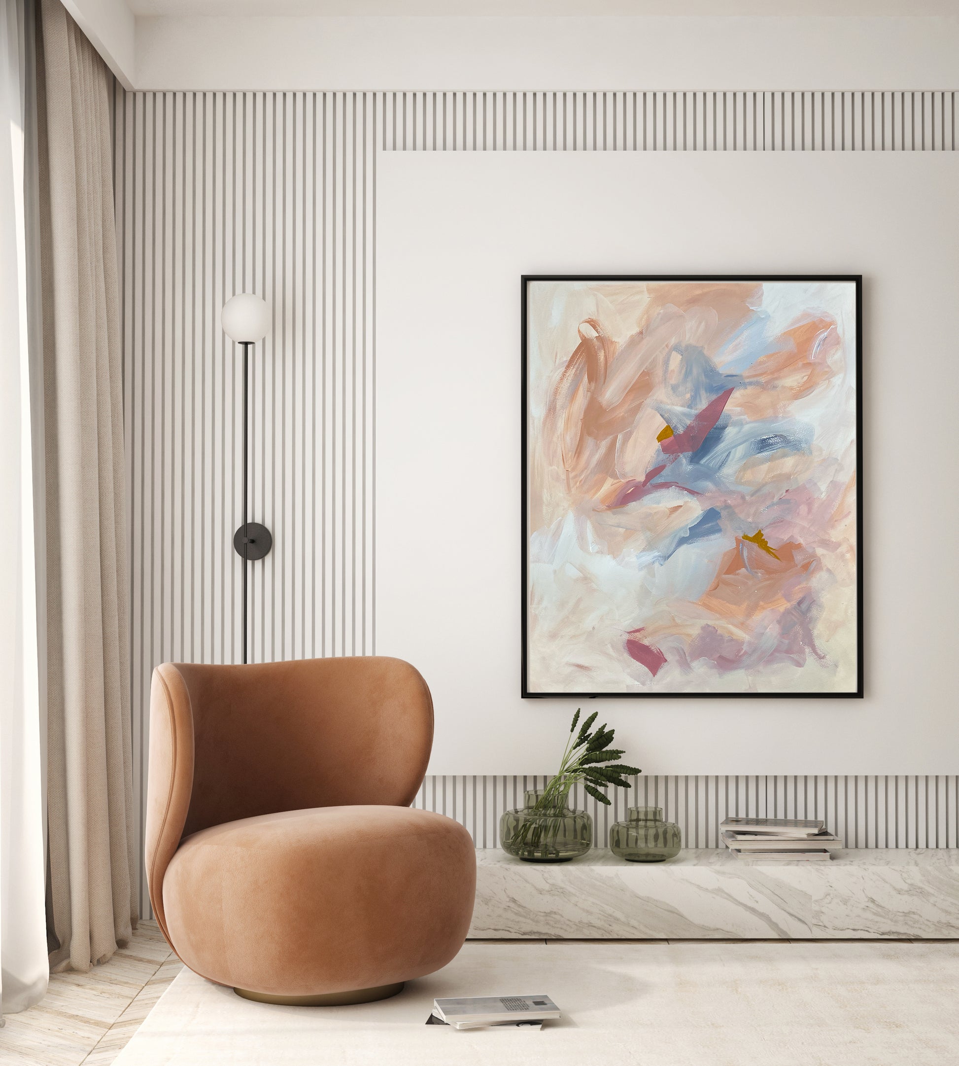 Summer evenings on a beach close a warm, sunny day with the sun dipping in the horizon. The colors are soothing to the soul, leading me to capture them abstractly in this artwork.