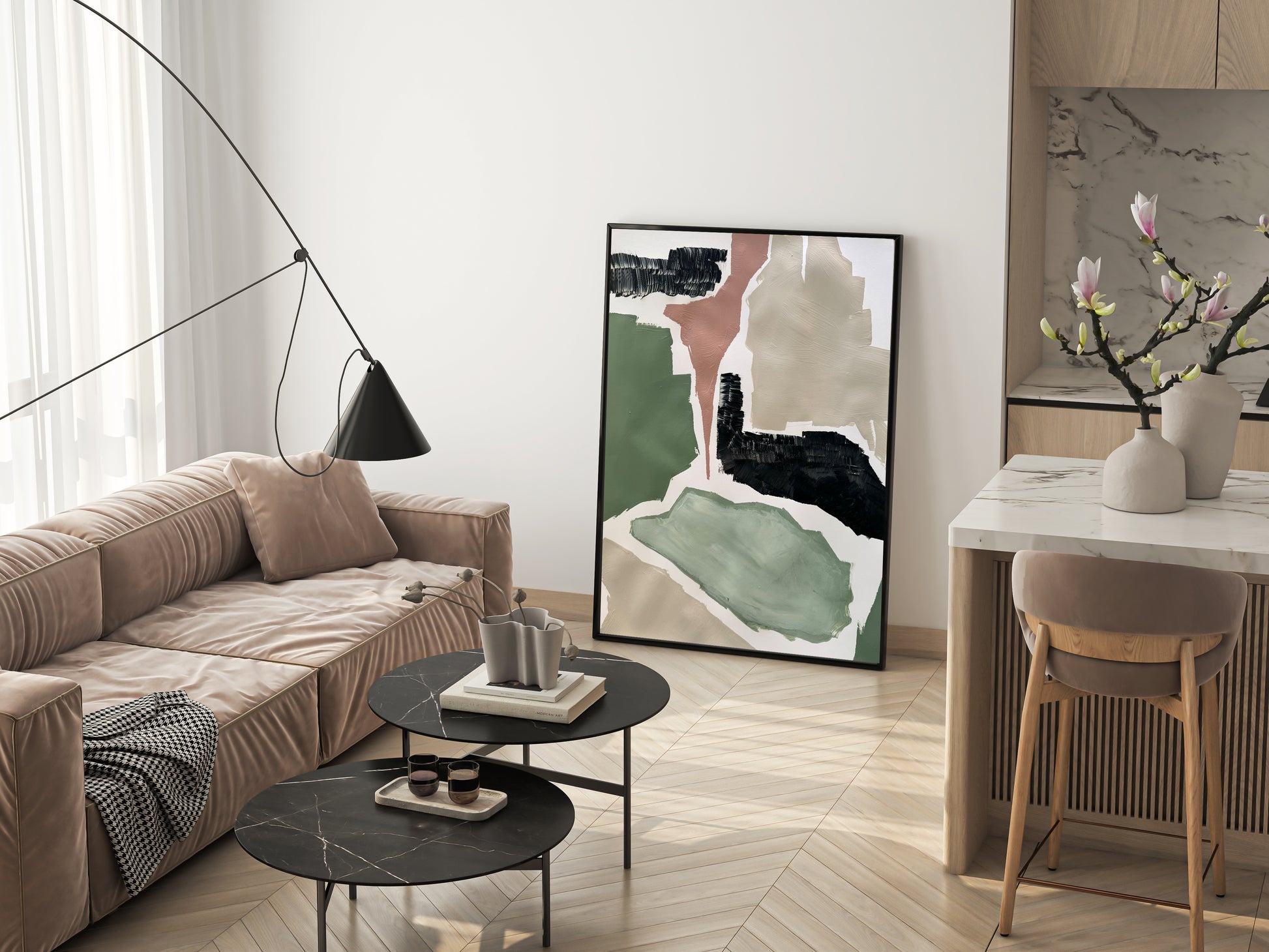 This captivating artwork, from the "Nature's Whisper" collection, is a vibrant exploration of the untamed spirit of nature. On paper, a dynamic interplay of black, brown, green, and beige forms shapes that hint at the wild beauty of the natural world. The rich black might represent the inky depths of a hidden forest, while the earthy browns evoke the strength of ancient trees. Lush green shapes peek through, suggesting vibrant foliage or a glimpse of a sunlit meadow. The calming beiges hint at sun-dappled earth or the sandy banks of a winding river.