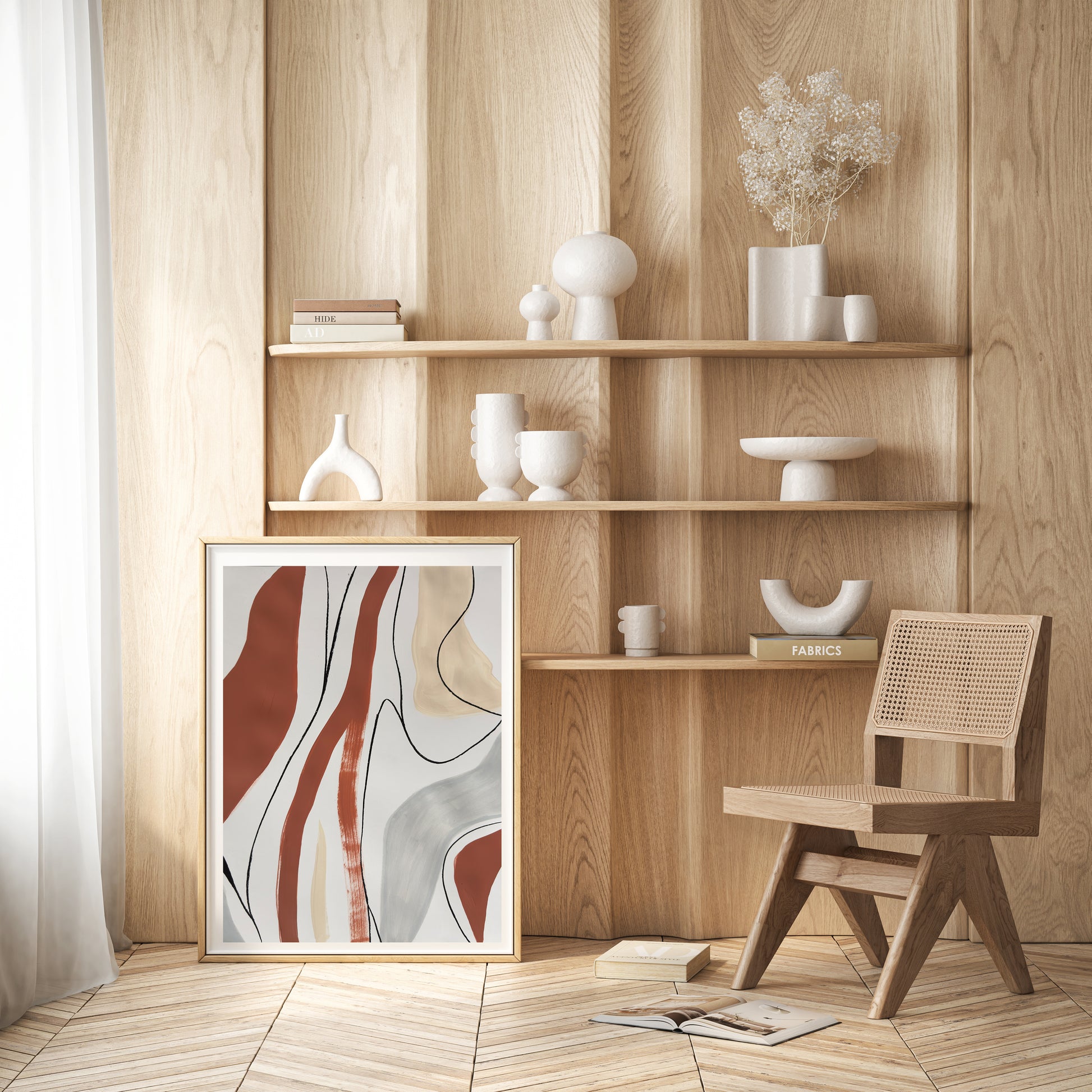 Warm neutrals glow like fading embers, held in place by cool charcoal strokes. This minimalist piece captures the fleeting beauty of twilight, a reminder to cherish the present moment.