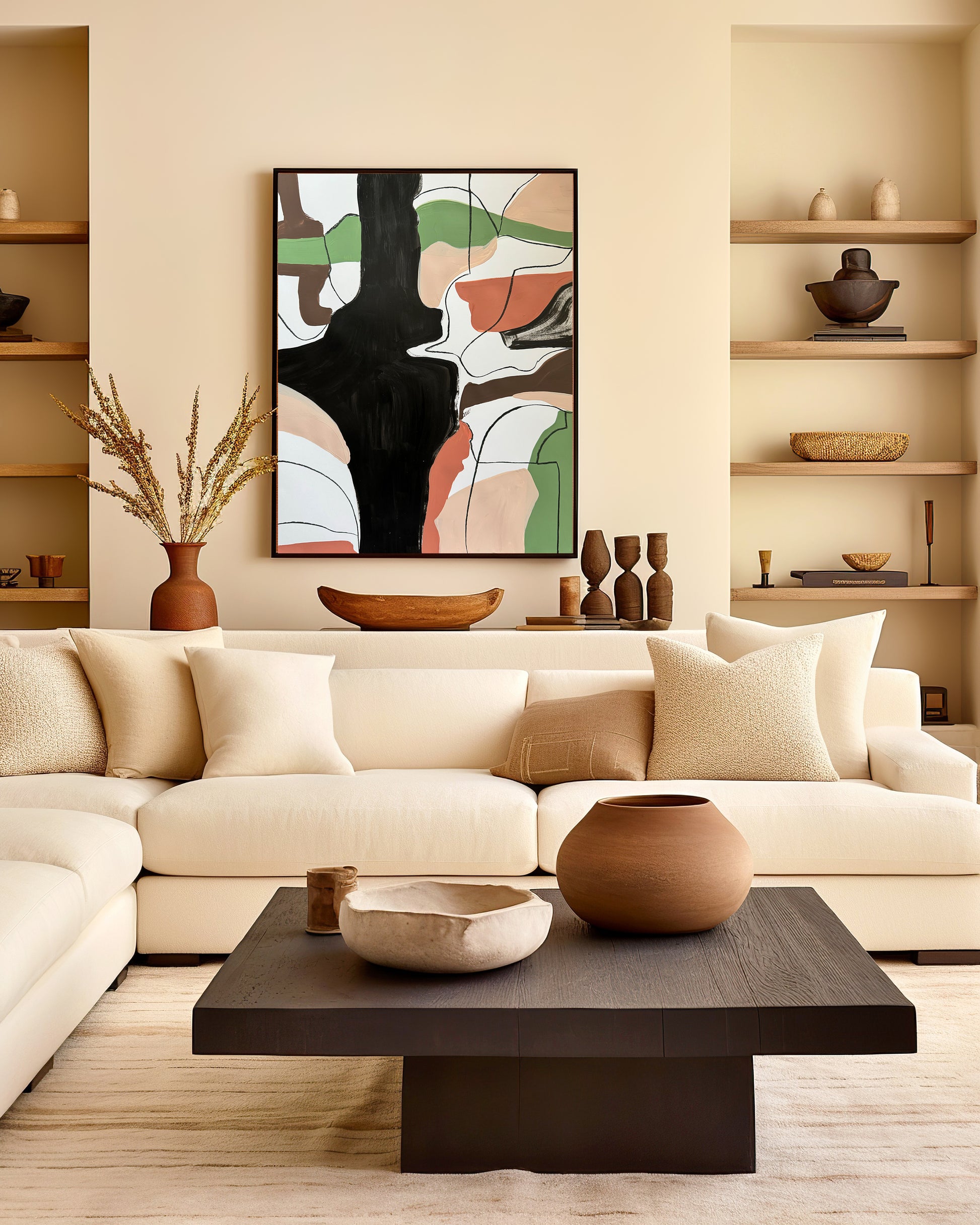 Lush greens, like a verdant tapestry, are gently held within earth’s warm embrace. This abstract landscape reflects the interconnectedness of nature, where vibrant life springs from the fertile depths of the brown earth.