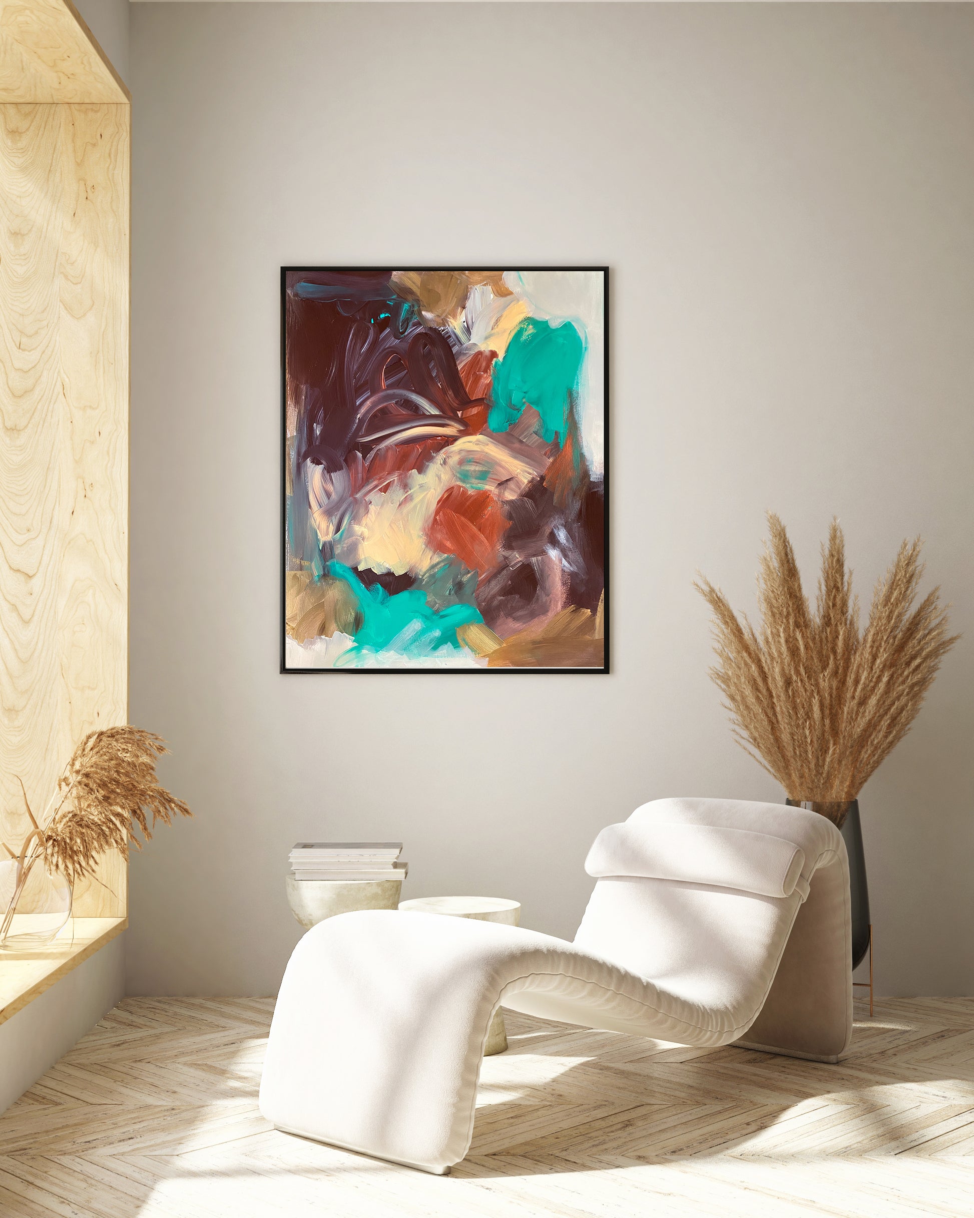 This original is an acrylic on paper, utilizing bold brushstrokes and large areas of color combined with small, subtle detailing to create a sense of light and depth. This abstract composition was inspired by the shadows and sunlight intermingling through a lush, forested canopy.
