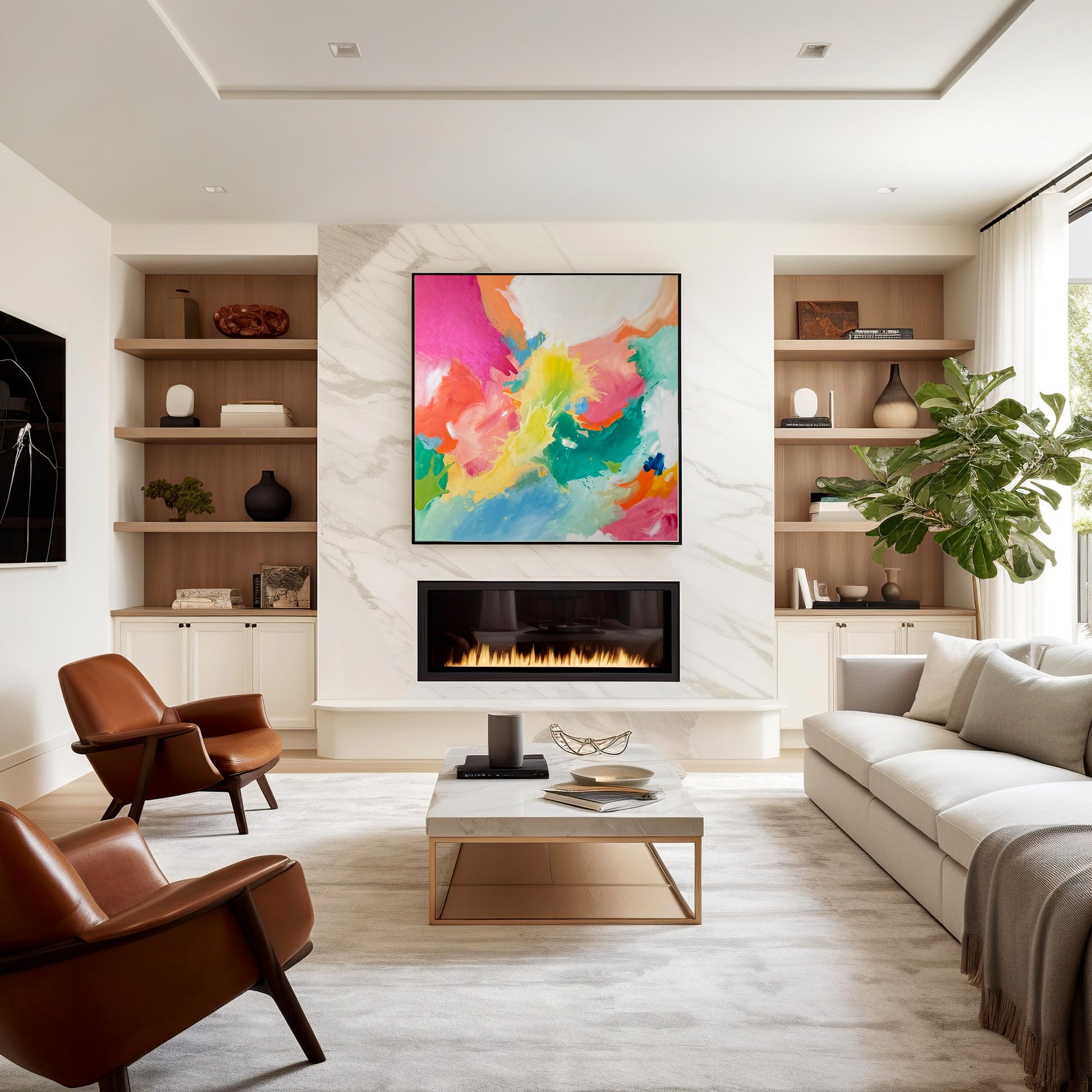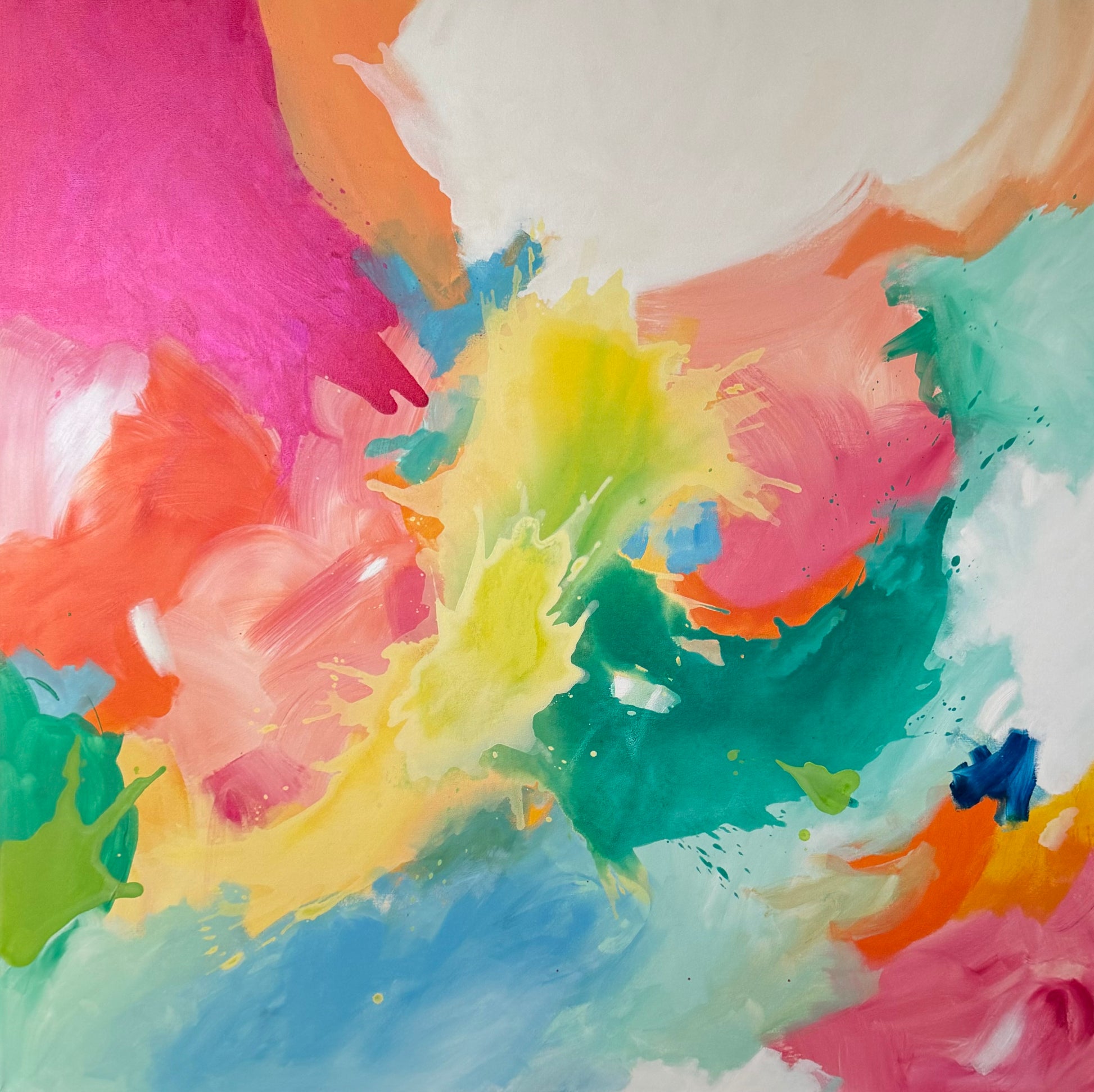 Let’s Fly is a hummingbird’s heartbeat captured on canvas. A whirlwind of color spins around a central blossom, its nectar an invitation to taste the intoxicating freedom of weightlessness.