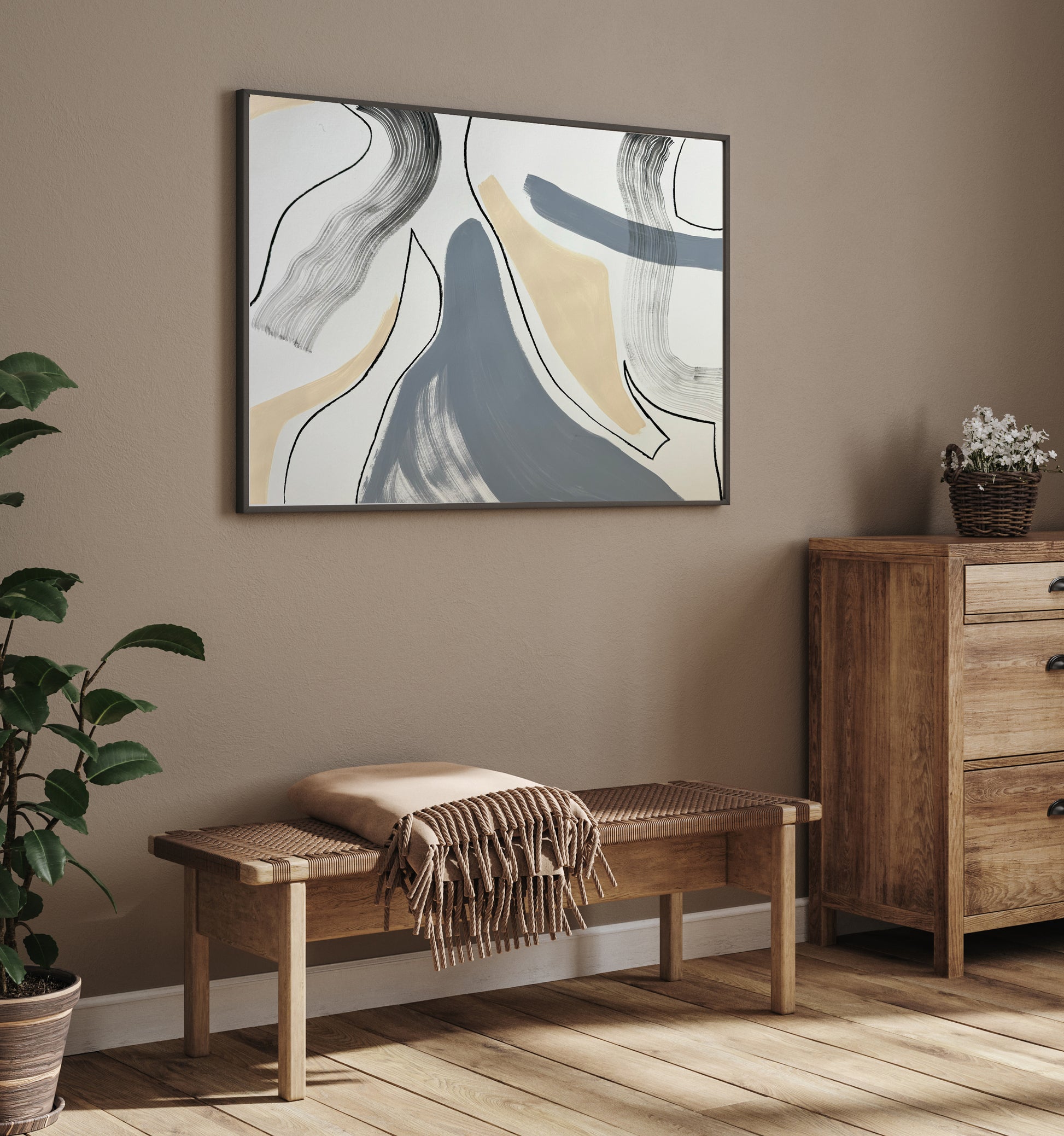 Under the moonlit sky, silver greys dance with creamy beiges, creating a symphony of ethereal shapes. This painting evokes a sense of dreamscapes and quiet contemplation.