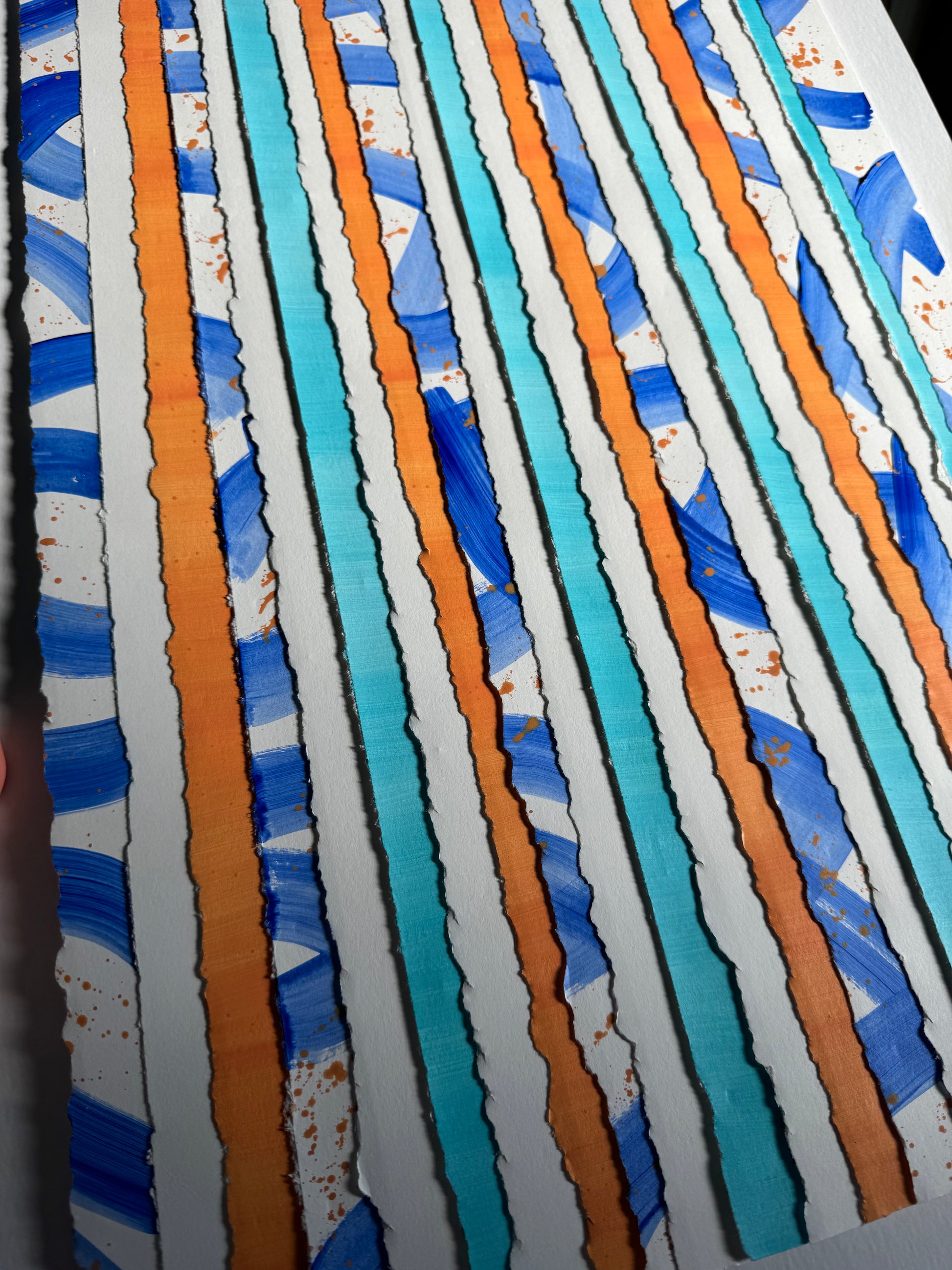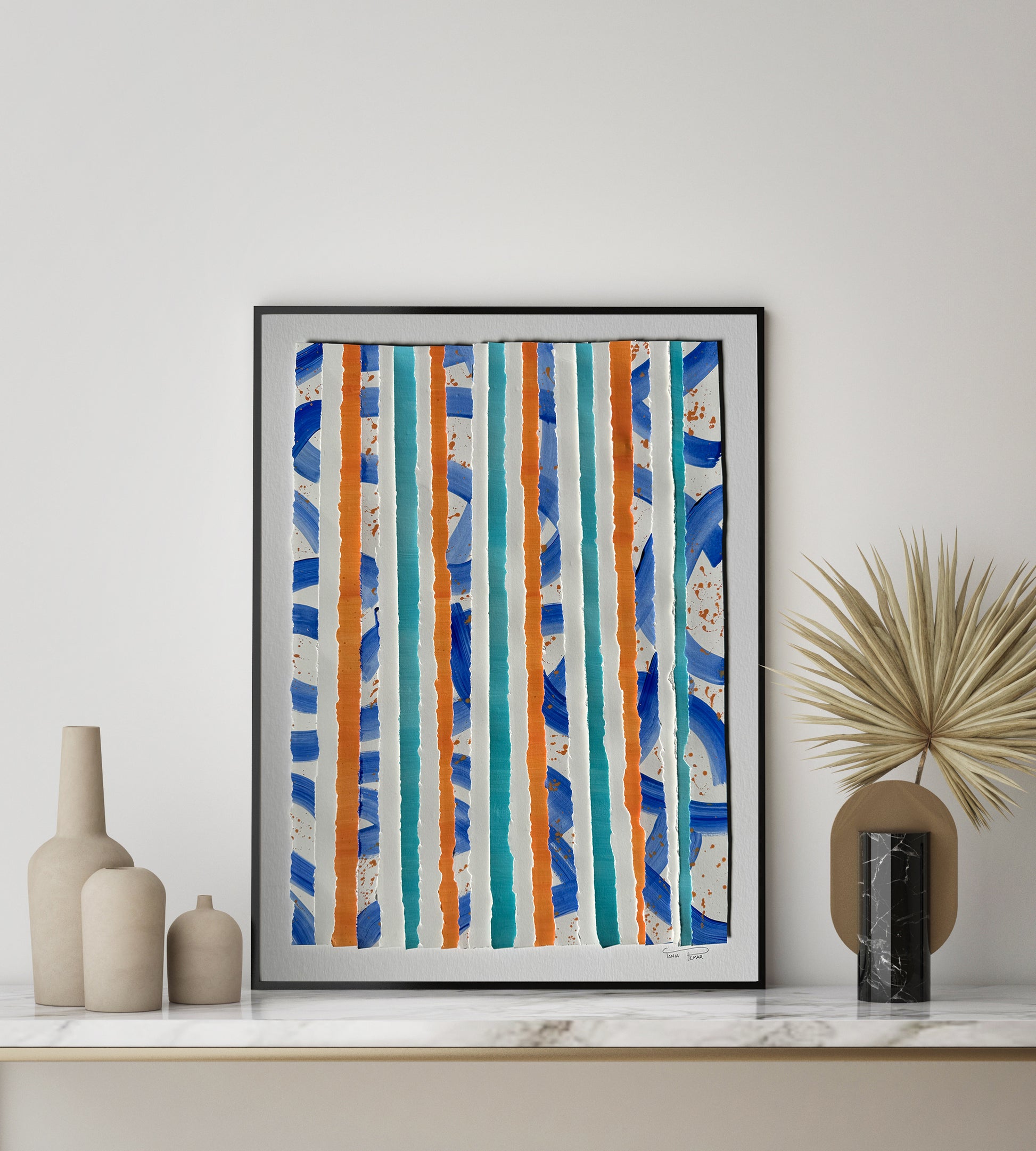 Inspired by the Mediterranean magnetism, this Series brings texture, bold pops of saturated colors and natural hues that evoke seaside memories of my summers in Spain. Paper texture in the artwork will capture the pattern the waves draw in the sand (see picture of "The birth of a painting").