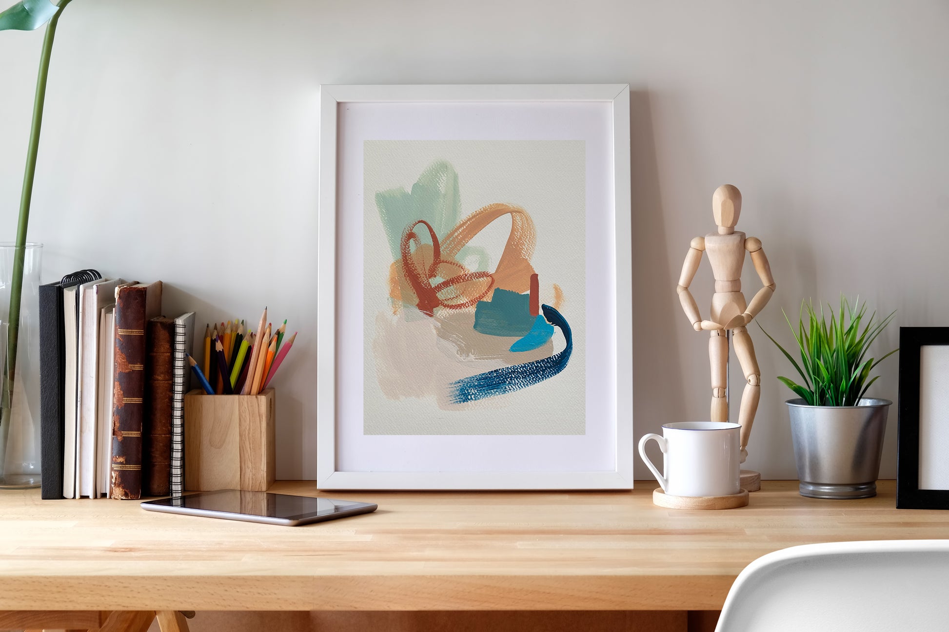 A colorful exploration in composition, shape, and scale with subtle texture highlights. The size and visual weight of the colors create balance out of an otherwise imbalanced composition. Beautiful alone or juxtapose this piece with another from the series for added interest.