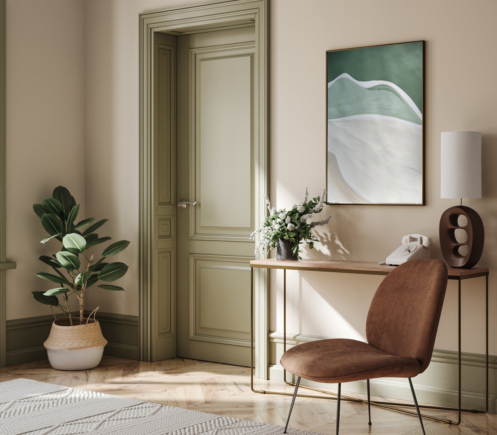 This abstract artwork invites you into a serene world inspired by nature's tranquility. Its soothing blend of green neutral tones and beige evokes a sense of calm and harmony. Organic forms dance across the surface, suggesting hidden depths and endless possibilities. Let this piece become a focal point in your space, bringing a touch of the outdoors indoors.