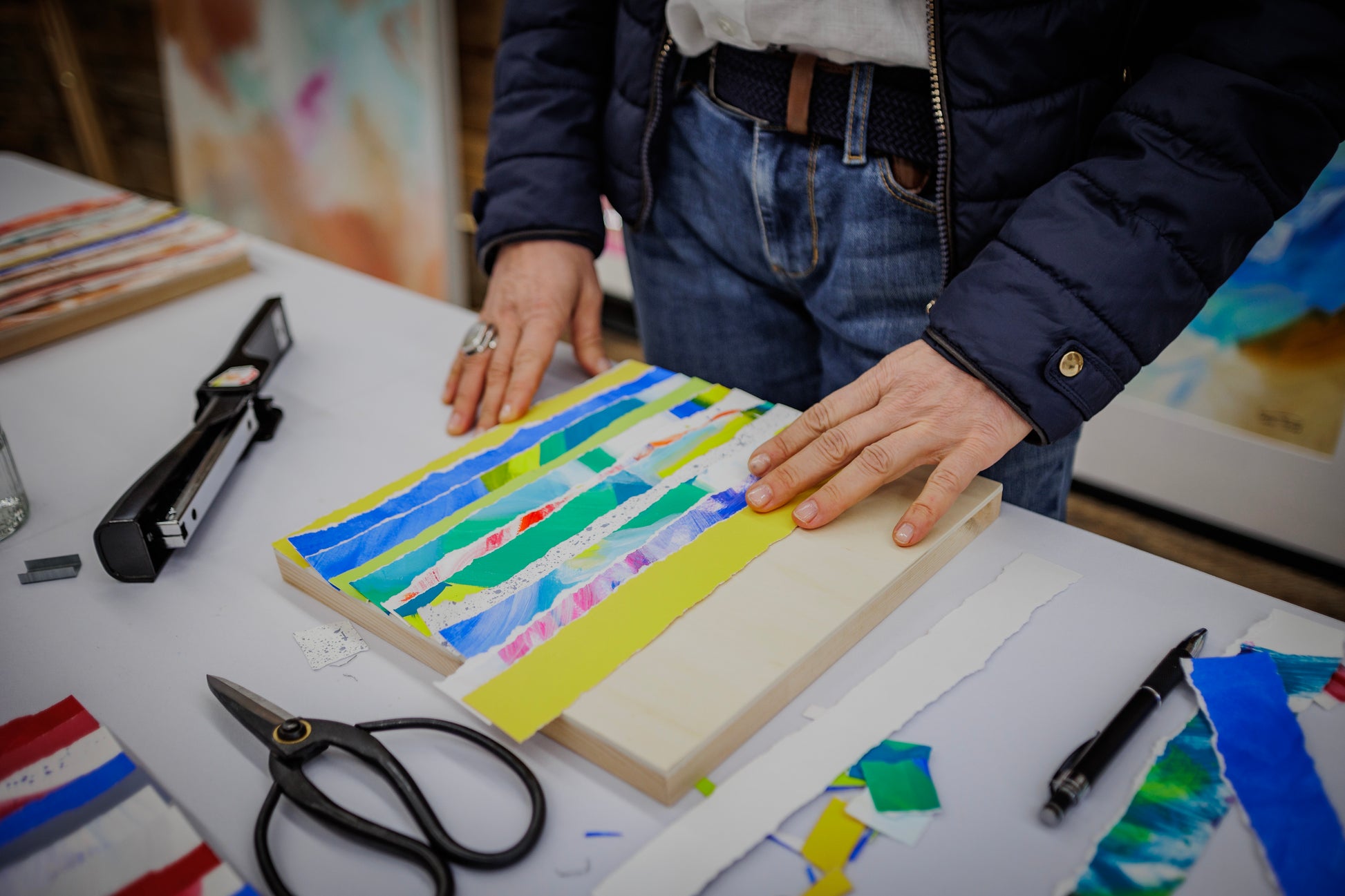All necessary supplies will be provided, so you just need to bring your enthusiasm and a desire to have a great time. The artist, Tania Pemar, will have cut up strips (colorful and neutrals) to mimic the style of her new collection of paintings. All you need to do is to select the ones that speak to you and arrange them to create your artwork. She will guide you! You will be able to create an artwork similar to the pictures.
